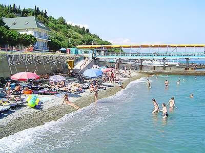 собственный, галечный, в 300 м от санатория, благоустроенный.